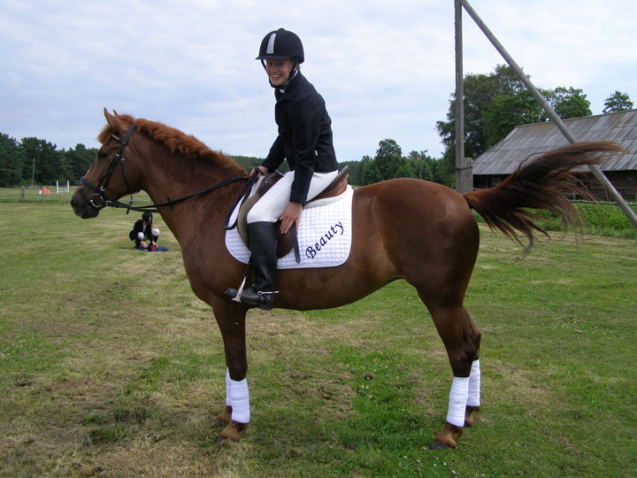 Kui ma olin, kas pikalt vanematele närvidele käinud või olin näidanud, et ratsutamine on tõesti minu teema siis sain lõpuks endale enda esimese hobuse, Beauty, sündinud 2001, eestlase ja ameerika traavli ristand ehk ma sain ta siis kui olin VI või VII klassis.